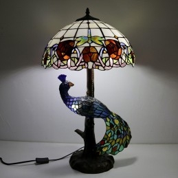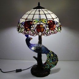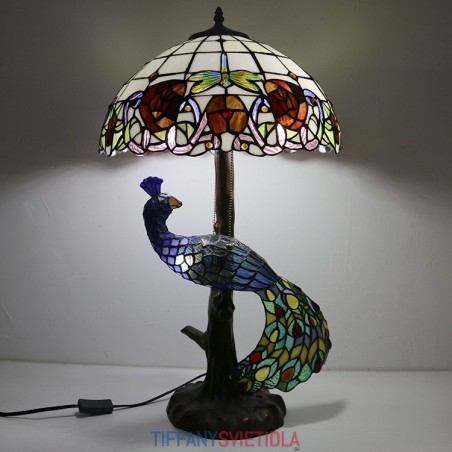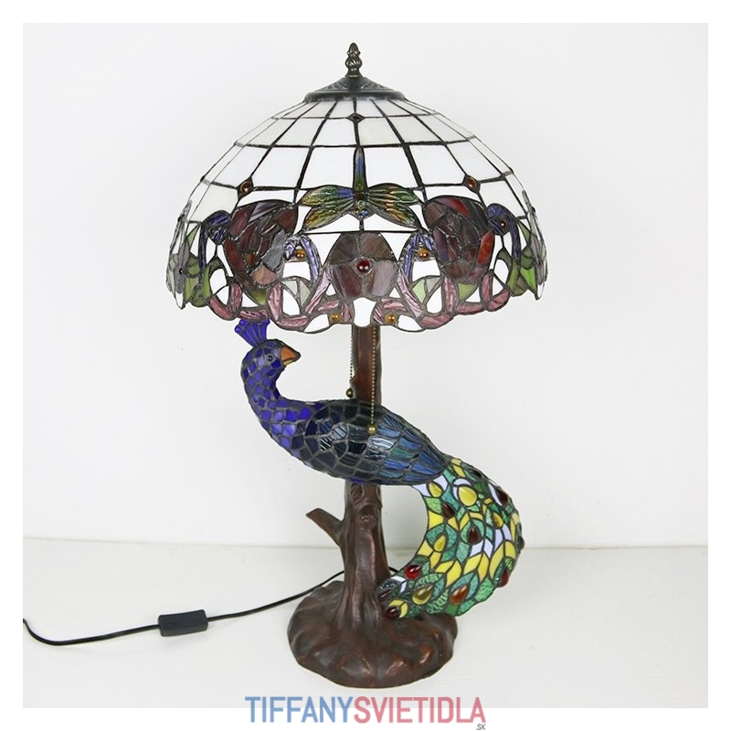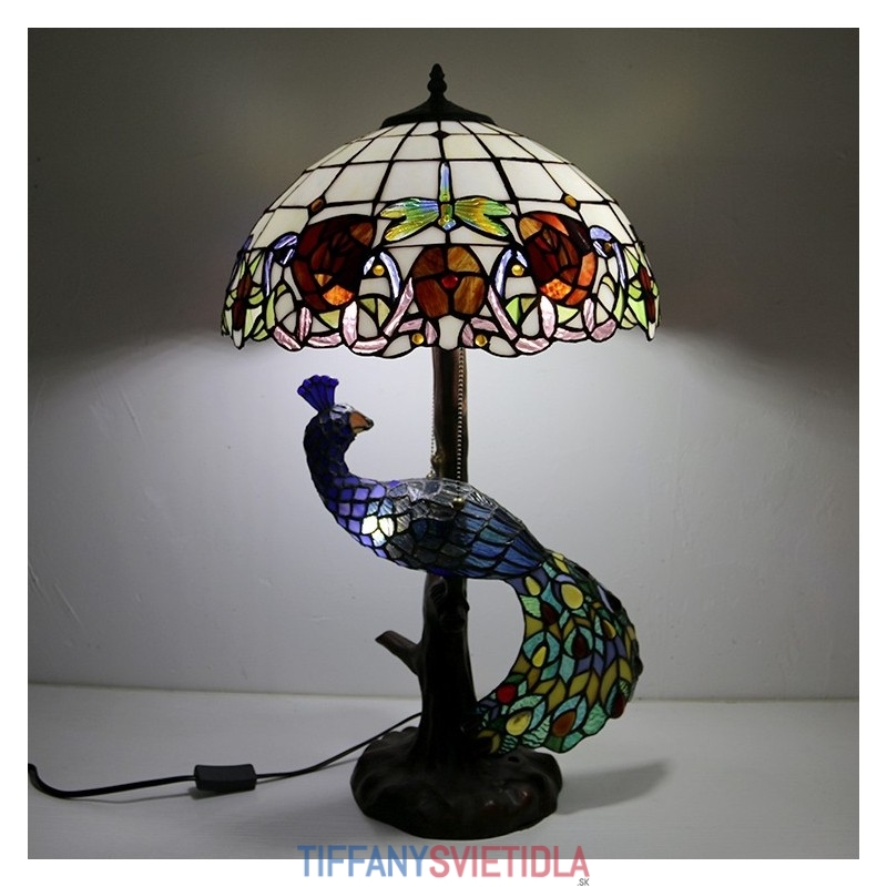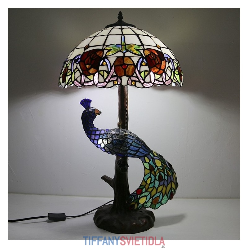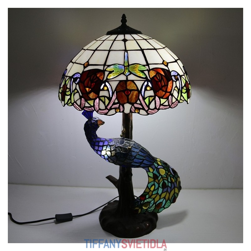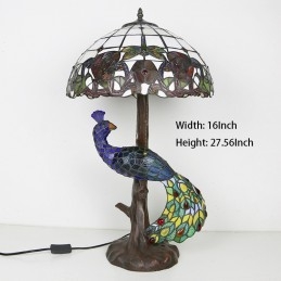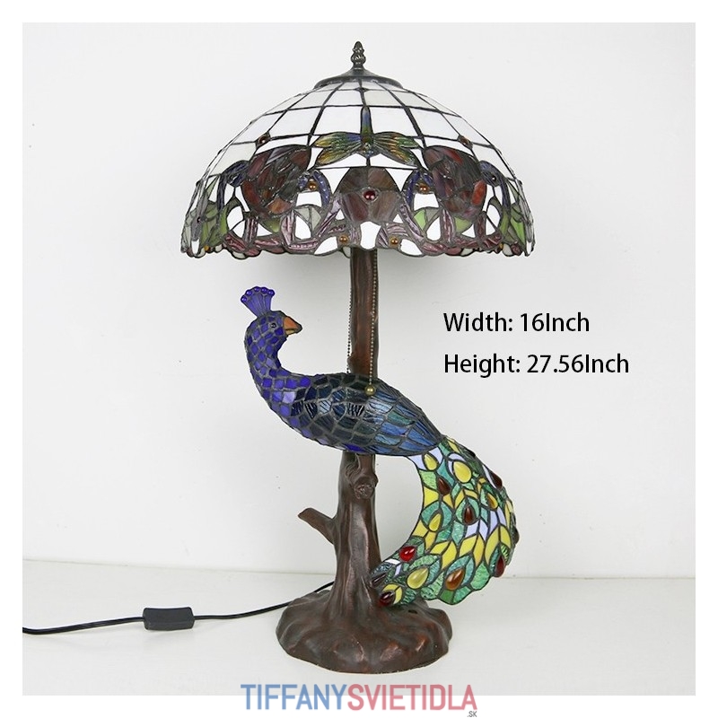 Stolová lampa v štýle Tiffany s pávovou základňou 16-palcová starožitná červená ružová vitrážové osvetlenie stola