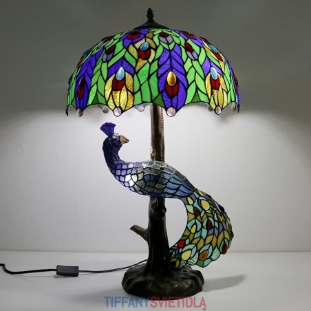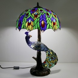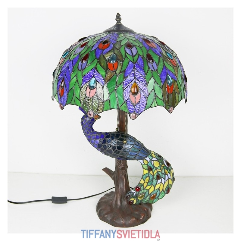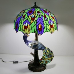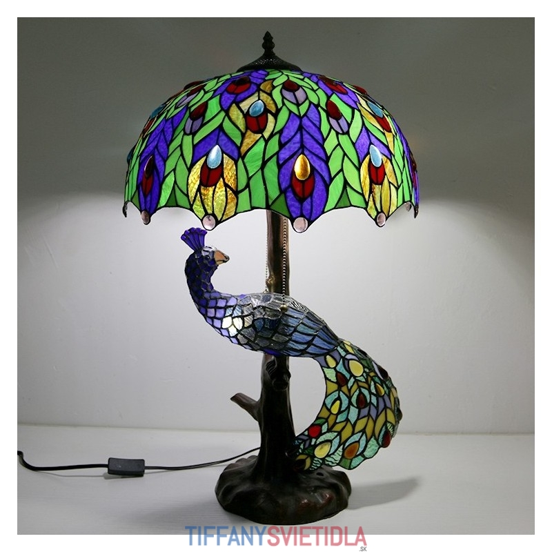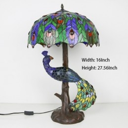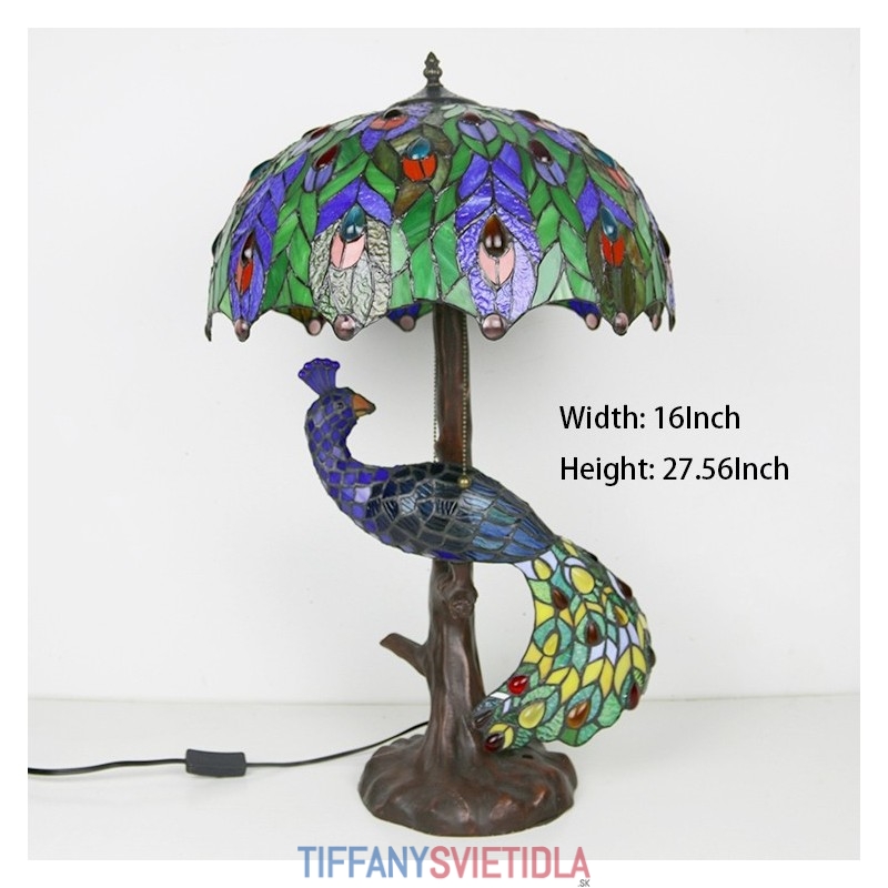 Stolová lampa v štýle Tiffany s pávovou základňou 16-palcové starožitné farebné vitrážové stolové osvetlenie