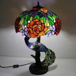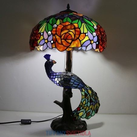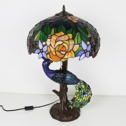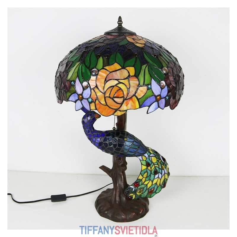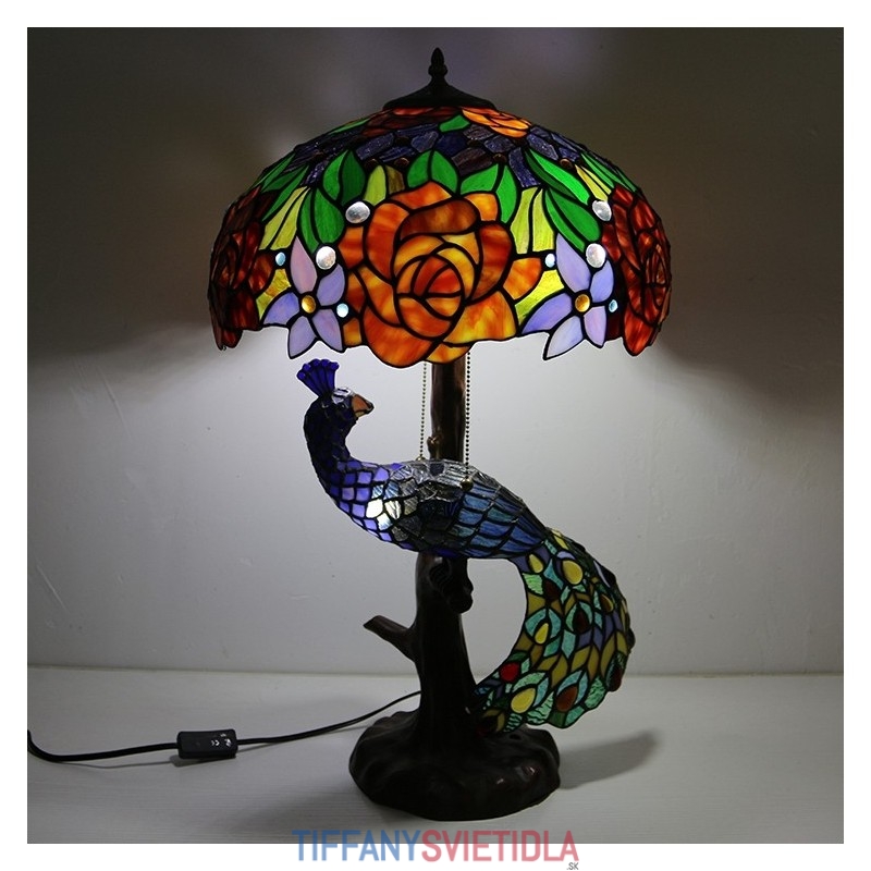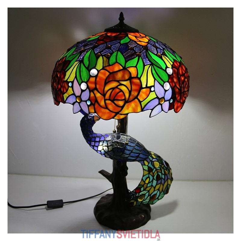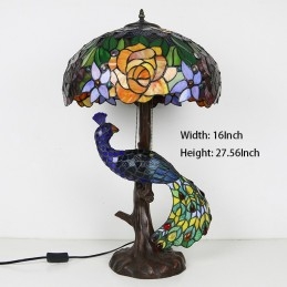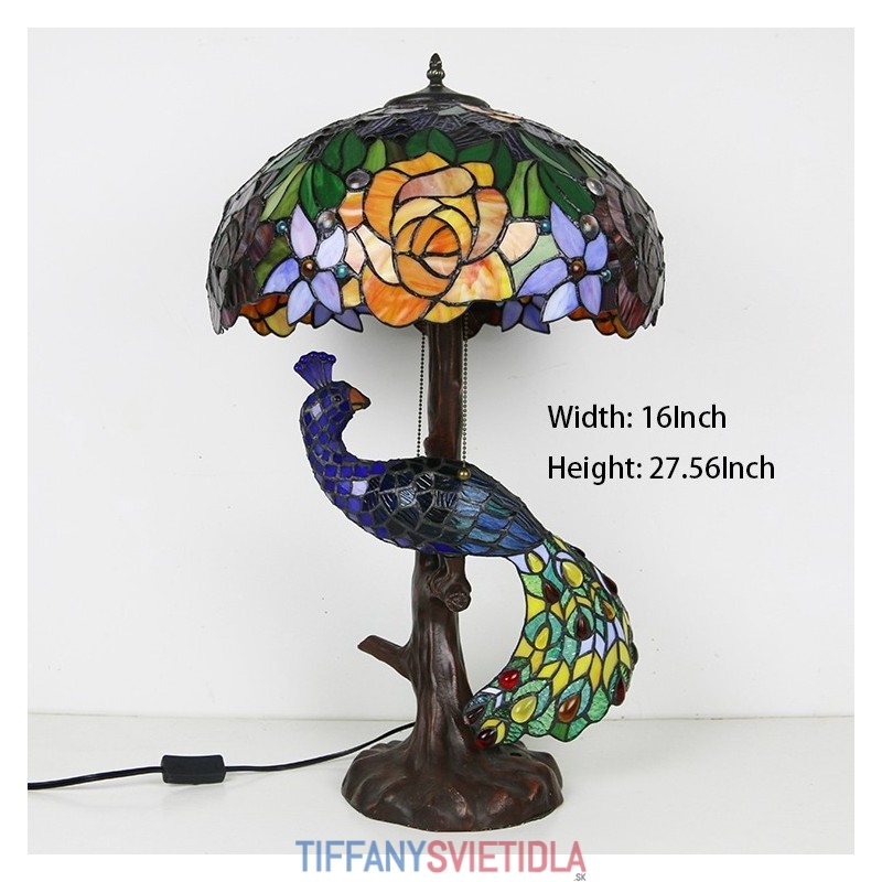 Stolová lampa v štýle Tiffany s pávovým podstavcom 16-palcové starožitné ružové vitráže stolové osvetlenie