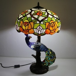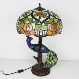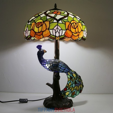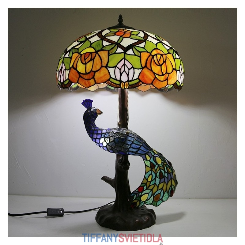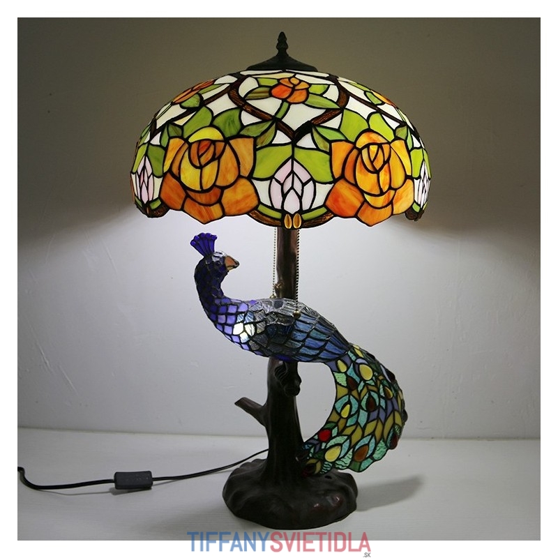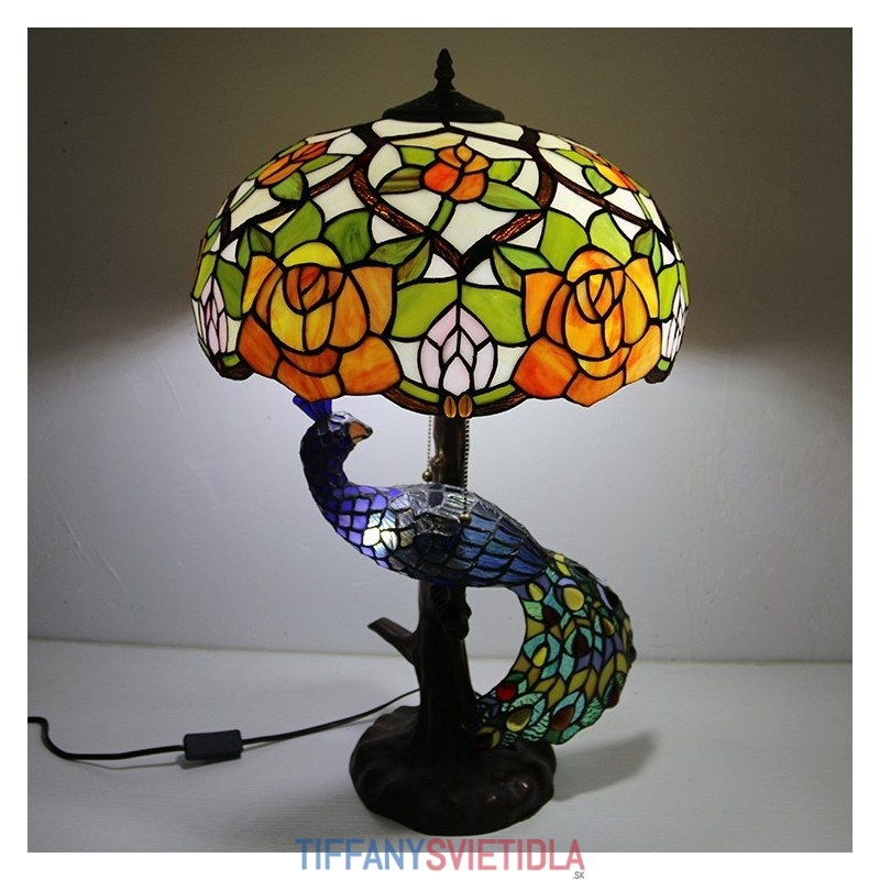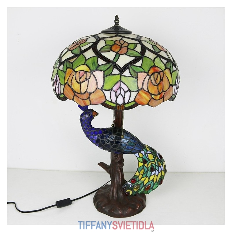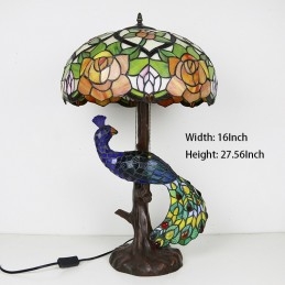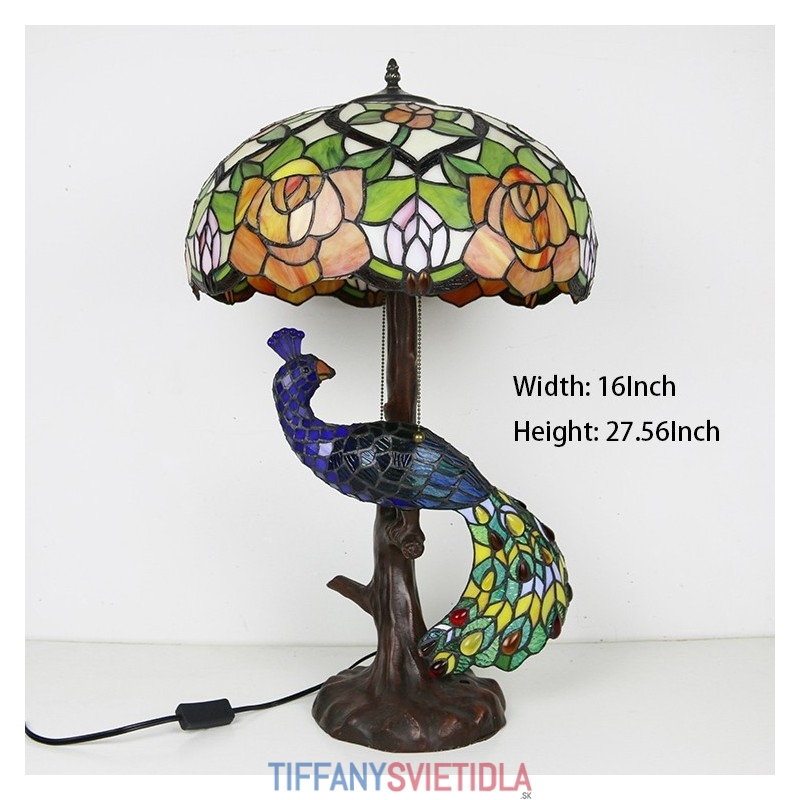 16-palcová ružová vitrážová lampa stolná lampa v štýle Tiffany so skleneným pávom a stromovou základňou