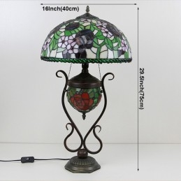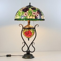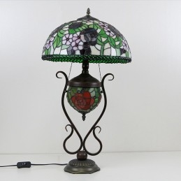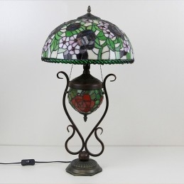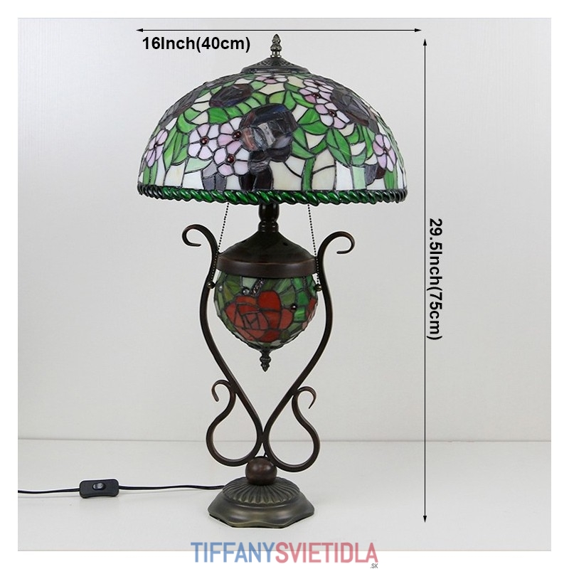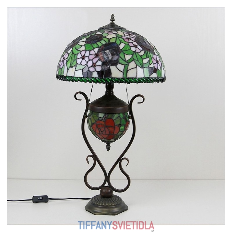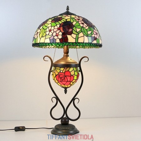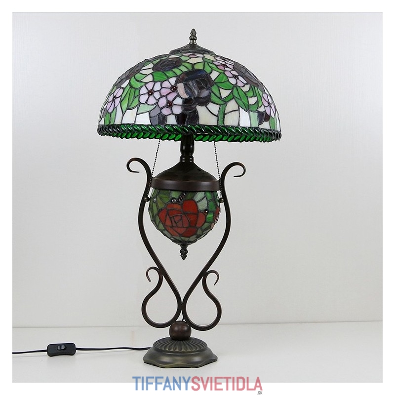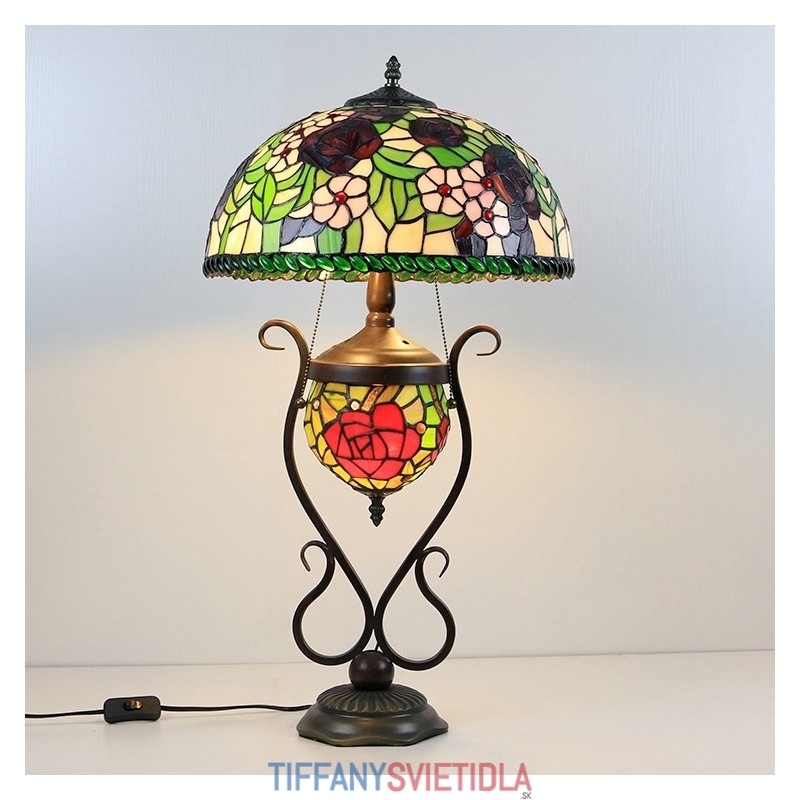 Stolová lampa v štýle Tiffany Banker z farebného skla ruža kvetinová s osvetlenou spálňou s manželskou posteľou a umeleckým osvetlením