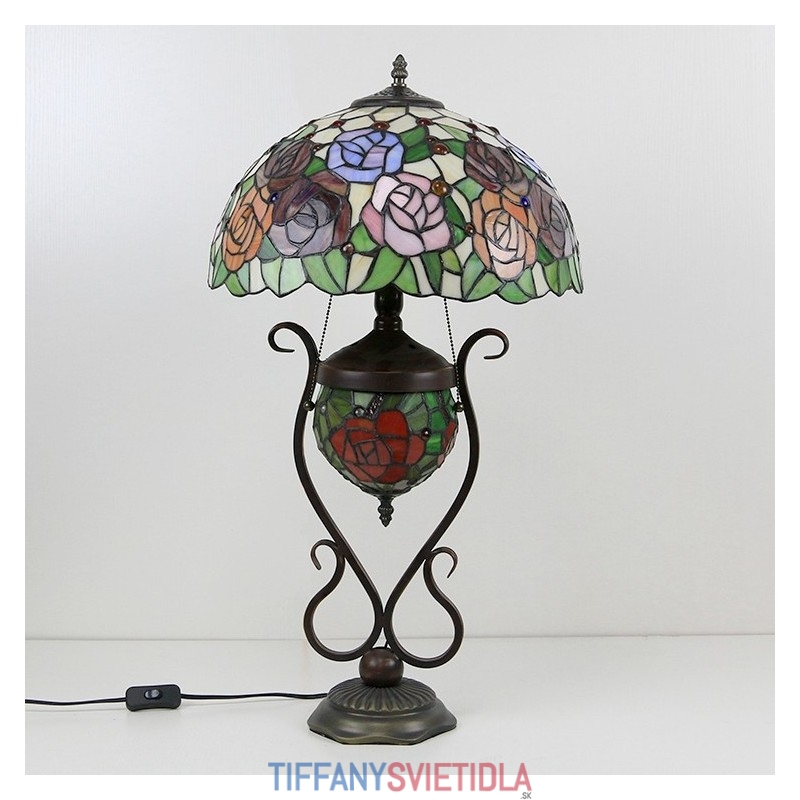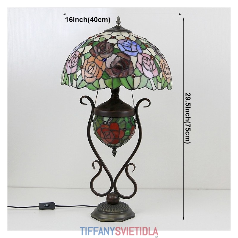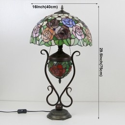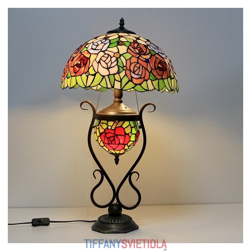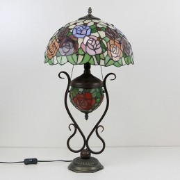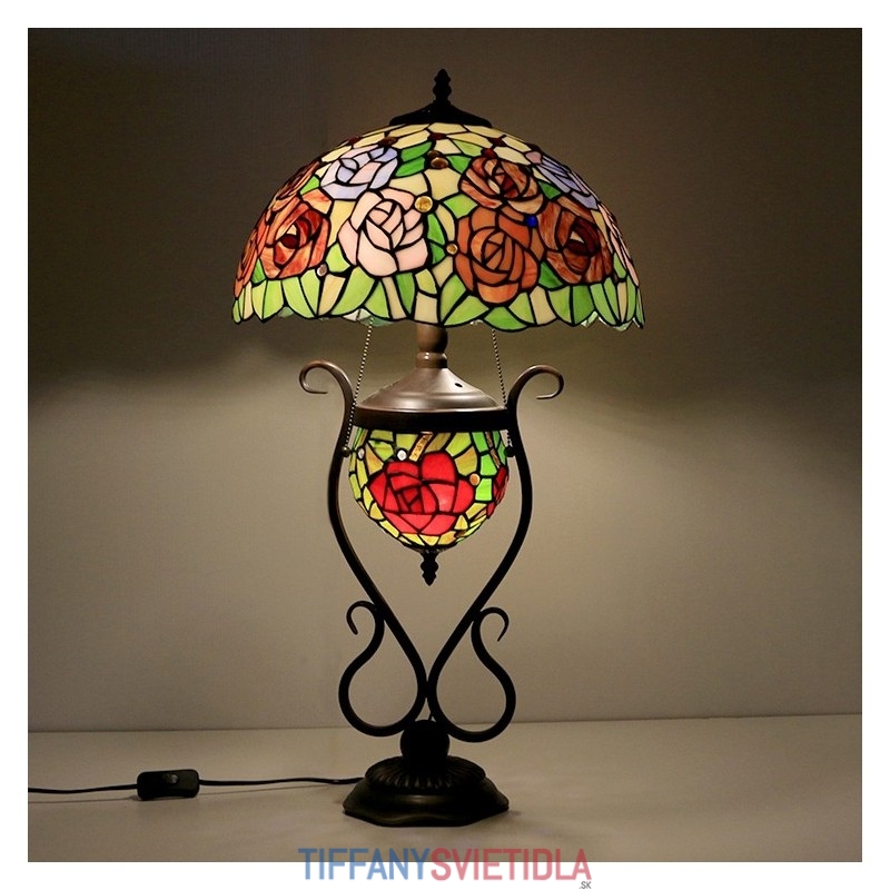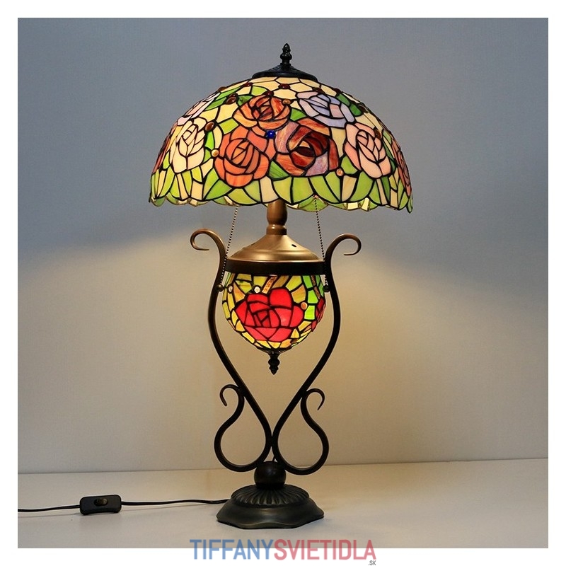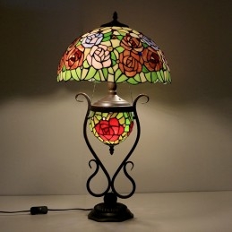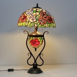 Tiffany lampa Stolová lampa z farebného skla Červený kvet ruže s osvetlenou spálňou s manželskou posteľou a umeleckým osvetlením