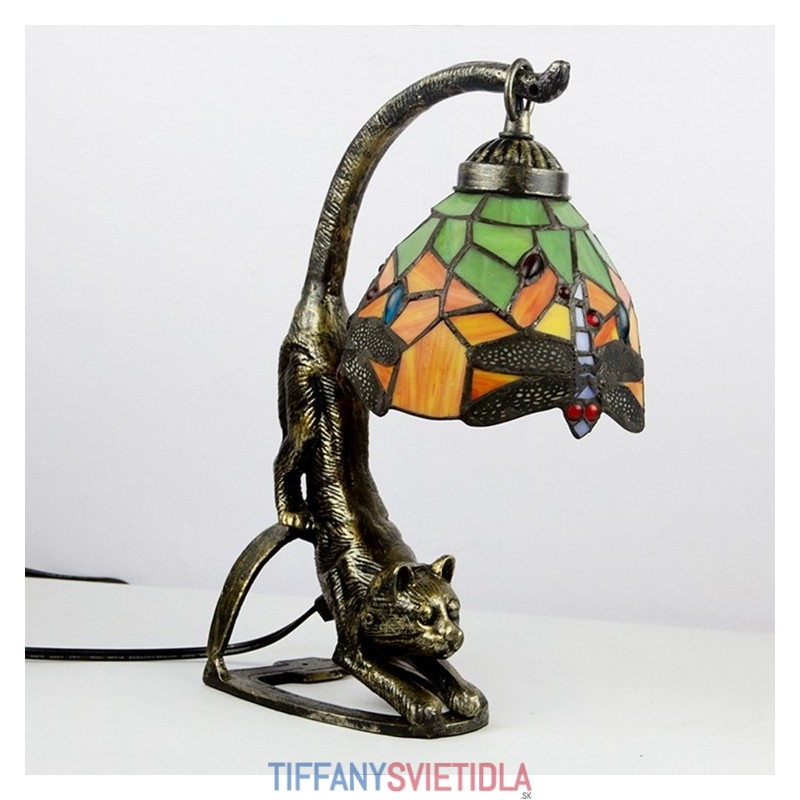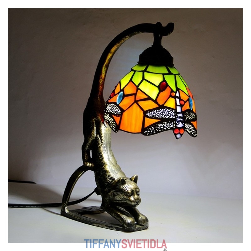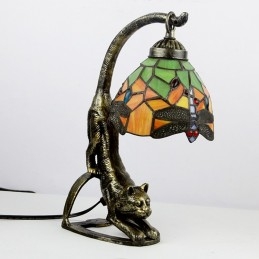Stolná lampa v štýle Tiffany Vážka z farebného skla Nočná lampa s mačacou základňou 15 palcov vysoká vintage starožitná