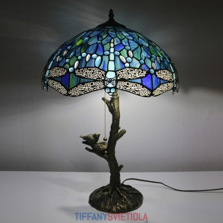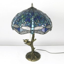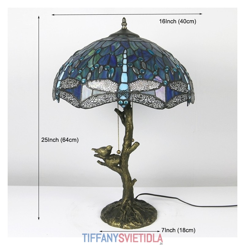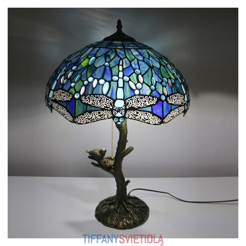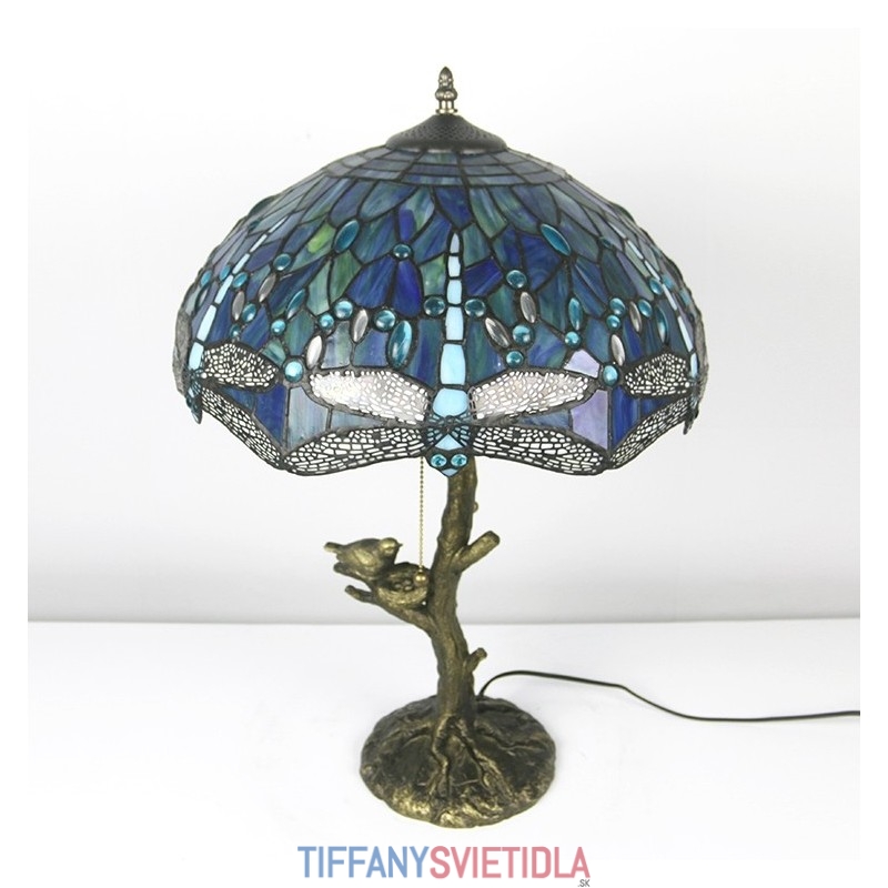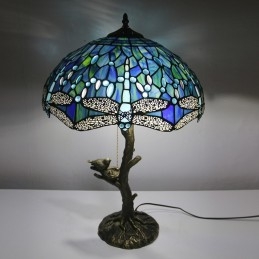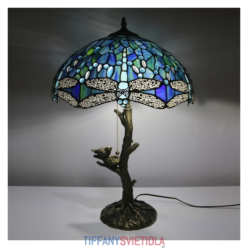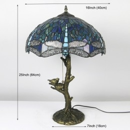Modrá stolová lampa z farebného skla Tiffany v štýle Tiffany so 16 palcovou širokou lampou a kmeňom stromu vtáčie hniezdo